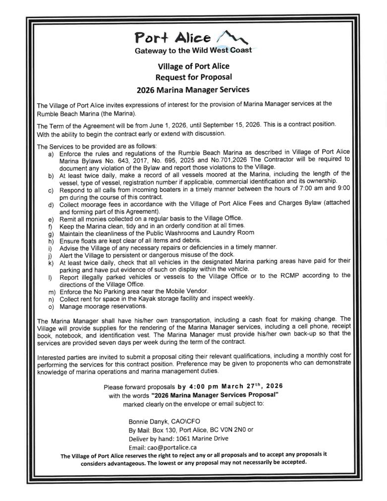 News Town Hall Municipal Documents Freedom of Information Careers, Bids & Tenders Planning Mayor & Council Meetings, Minutes & Agendas Bylaws Official Community Plan Get in Touch if you have questions regarding bylaw terms and enforcement. Contact Us Home» Careers, Bids & Tenders» 2026 Marina Manager Services – Request for Proposals 2026 Marina Manager Services – Request for Proposals Posted 03/05/26 Back