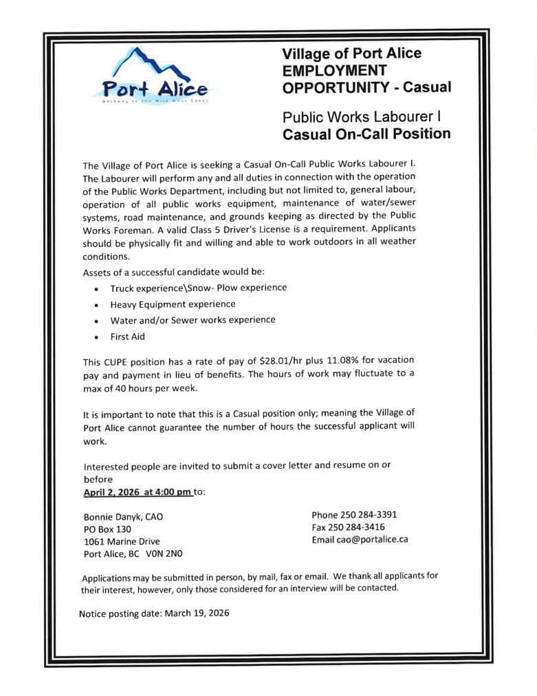 News Town Hall Municipal Documents Freedom of Information Careers, Bids & Tenders Planning Mayor & Council Meetings, Minutes & Agendas Bylaws Official Community Plan Get in Touch if you have questions regarding bylaw terms and enforcement. Contact Us Home» Careers, Bids & Tenders» Public Works Casual Labourer 1 Public Works Casual Labourer 1 Posted 03/19/26 Back